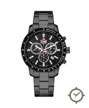Eine Chronograph-Uhr mit einem 37.5mm Gehäuse im Vintage-Stil gefertigt aus Edelstahl mit einem Zifferblatt in schwarz und einer besonderen "textured/grain finish"-Oberfläche.