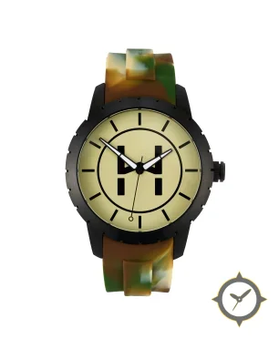 Eine Militär-Uhr mit einem markanten 47.5mm Auftritt am Handgelenk, gefertigt aus Edelstahl mit einem Zifferblatt in gelb und einer besonderen "matte"-Oberfläche.
