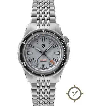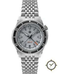 Eine Taucheruhr-Uhr mit einem markanten 45.5mm Auftritt am Handgelenk, gefertigt aus Edelstahl mit einem Zifferblatt in silber und einer besonderen "brushed"-Oberfläche und einer echten GMT-Funktion, mit der du eine zweite Zeitzone verfolgen kannst.