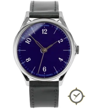 Eine Dress-Uhr mit einem markanten 48.5mm Auftritt am Handgelenk, gefertigt aus Edelstahl mit einem Zifferblatt in marineblau und einer besonderen "vitreous enamel, glossy"-Oberfläche.