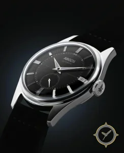 Eine Dress-Uhr mit einem 36.5mm Gehäuse im Vintage-Stil gefertigt aus Gold mit einem Zifferblatt in schwarz und einer besonderen "smooth lacquer center with guilloché/ribbed outer ring"-Oberfläche.