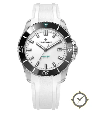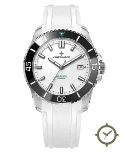 Eine Taucheruhr-Uhr mit einem markanten 49.5mm Auftritt am Handgelenk, gefertigt aus Edelstahl mit einem Zifferblatt in weiß und einer besonderen "glossy lacquer"-Oberfläche.