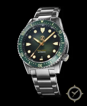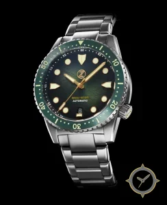 Eine Taucheruhr-Uhr mit einem 35.5mm Gehäuse im Vintage-Stil gefertigt aus Edelstahl mit einem Zifferblatt in grün und einer besonderen "sunburst"-Oberfläche.