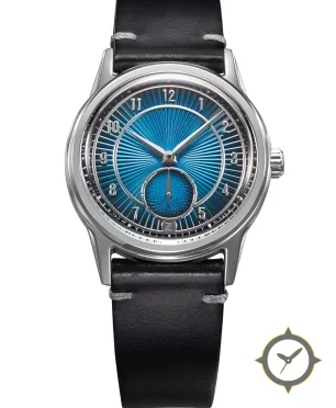 Eine Dress-Uhr mit einem vielseitigen 38.5mm Gehäuse, das an fast jedes Handgelenk passt, gefertigt aus Edelstahl mit einem Zifferblatt in blau und einer besonderen "guilloché (sunburst)"-Oberfläche.
