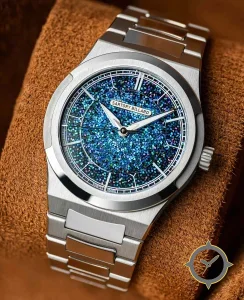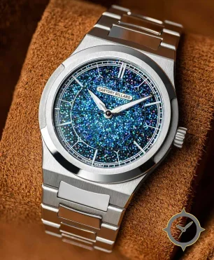 Eine Luxus-Uhr mit einem 37mm Gehäuse im Vintage-Stil gefertigt aus Edelstahl mit einem Zifferblatt in blau und einer besonderen "sparkling crushed-stone / aventurine-like mosaic texture"-Oberfläche.