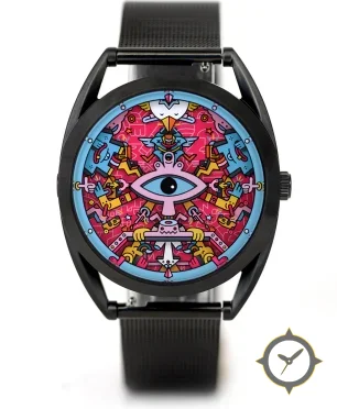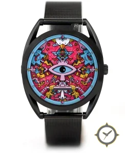 Eine Minimalistisch-Uhr mit einem 30mm Gehäuse im Vintage-Stil gefertigt aus Edelstahl mit einem Zifferblatt in rot und einer besonderen "flat printed graphic"-Oberfläche.