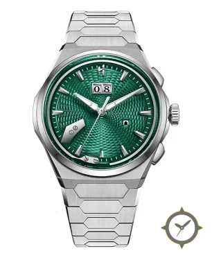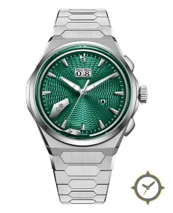 Eine Luxus-Uhr mit einem markanten 41.5mm Auftritt am Handgelenk, gefertigt aus Edelstahl mit einem Zifferblatt in grün und einer besonderen "guilloché (spiral / wavy texture)"-Oberfläche und einer praktischen Gangreserveanzeige.
