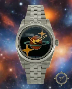 Eine Vintage-Uhr mit einem 34mm Gehäuse im Vintage-Stil gefertigt aus Edelstahl mit einem Zifferblatt in schwarz und einer besonderen "glossy enamel lacquer with printed graphic"-Oberfläche.