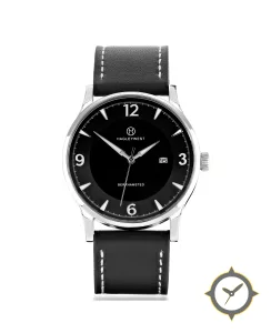 Eine Dress-Uhr mit einem vielseitigen 41mm Gehäuse, das an fast jedes Handgelenk passt, gefertigt aus Edelstahl mit einem Zifferblatt in schwarz und einer besonderen "matte"-Oberfläche.