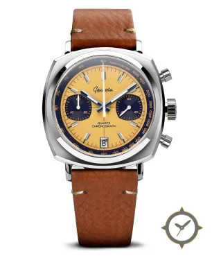 Eine Chronograph-Uhr mit einem 33.5mm Gehäuse im Vintage-Stil gefertigt aus Edelstahl mit einem Zifferblatt in gelb und einer besonderen "matte"-Oberfläche.