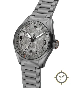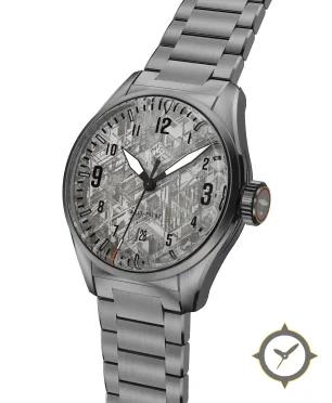 Eine Pilot-Uhr mit einem 34mm Gehäuse im Vintage-Stil gefertigt aus Edelstahl mit einem Zifferblatt in silber und einer besonderen "meteorite (Widmanstätten) texture"-Oberfläche.