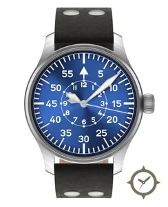 Eine Pilot-Uhr mit einem markanten 43mm Auftritt am Handgelenk, gefertigt aus Edelstahl mit einem Zifferblatt in blau und einer besonderen "sunburst brushed"-Oberfläche.