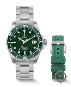 Eine Taucheruhr-Uhr mit einem markanten 44mm Auftritt am Handgelenk, gefertigt aus Edelstahl mit einem Zifferblatt in grün und einer besonderen "hexagonal honeycomb"-Oberfläche.