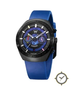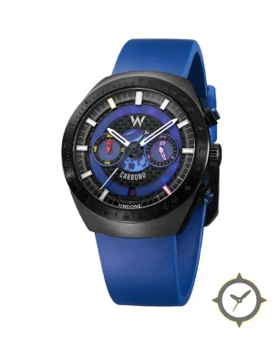 Eine Sport-Uhr mit einem markanten 48mm Auftritt am Handgelenk, gefertigt aus Edelstahl mit einem Zifferblatt in blau und einer besonderen "carbon-fiber center with matte outer ring"-Oberfläche.