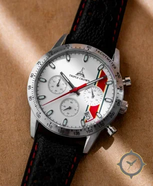 Eine Racing-Uhr mit einem markanten 42mm Auftritt am Handgelenk, gefertigt aus Edelstahl mit einem Zifferblatt in weiß und einer besonderen "matte lacquer"-Oberfläche.