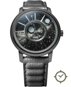 Eine Skelett-Uhr mit einem markanten 47mm Auftritt am Handgelenk, gefertigt aus Edelstahl mit einem Zifferblatt in schwarz und einer besonderen "starry-sky with metallic radial gradient"-Oberfläche und einer wunderschönen Mondphasenanzeige.