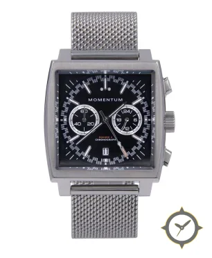 Eine Chronograph-Uhr mit einem 35mm Gehäuse im Vintage-Stil gefertigt aus Edelstahl mit einem Zifferblatt in schwarz und einer besonderen "lacquer"-Oberfläche.