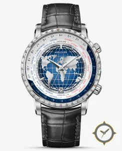Eine Weltzeituhr-Uhr mit einem 36mm Gehäuse im Vintage-Stil gefertigt aus Edelstahl mit einem Zifferblatt in blau und einer besonderen "sunburst metallic with printed globe motif"-Oberfläche, ideal für Weltenbummler dank der Weltzeit-Funktion.