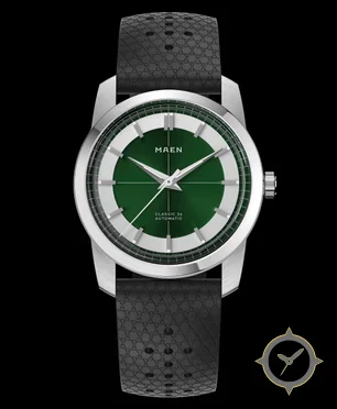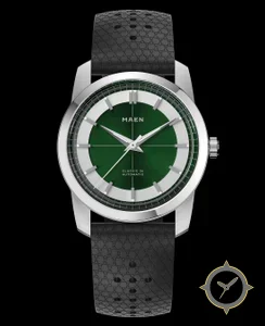 Eine Dress-Uhr mit einem 35.5mm Gehäuse im Vintage-Stil gefertigt aus Edelstahl mit einem Zifferblatt in grün und einer besonderen "sunburst center with ribbed sector ring"-Oberfläche.
