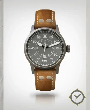 Eine Pilot-Uhr mit einem markanten 41.5mm Auftritt am Handgelenk, gefertigt aus Edelstahl mit einem Zifferblatt in grau und einer besonderen "matte"-Oberfläche.
