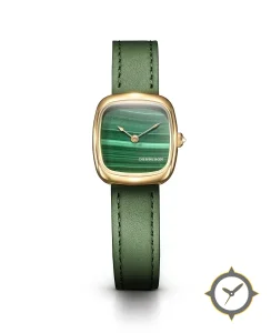 Eine Dress-Uhr mit einem 28mm Gehäuse im Vintage-Stil gefertigt aus Gold mit einem Zifferblatt in grün und einer besonderen "banded malachite (stone)"-Oberfläche.
