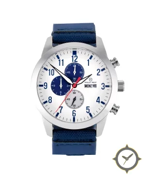 Eine Chronograph-Uhr mit einem markanten 42mm Auftritt am Handgelenk, gefertigt aus Edelstahl mit einem Zifferblatt in weiß und einer besonderen "matte"-Oberfläche.