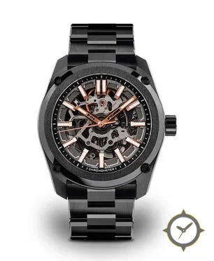 Eine Skelett-Uhr mit einem markanten 49mm Auftritt am Handgelenk, gefertigt aus Edelstahl mit einem Zifferblatt in schwarz und einer besonderen "open-worked / skeletonized"-Oberfläche.