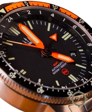 Eine GMT-Uhr mit einem 36.5mm Gehäuse im Vintage-Stil gefertigt aus Edelstahl mit einem Zifferblatt in schwarz und einer besonderen "matte"-Oberfläche und einer echten GMT-Funktion, mit der du eine zweite Zeitzone verfolgen kannst.