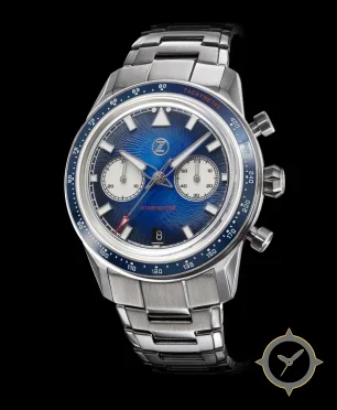 Eine Chronograph-Uhr mit einem vielseitigen 39.5mm Gehäuse, das an fast jedes Handgelenk passt, gefertigt aus Edelstahl mit einem Zifferblatt in blau und einer besonderen "sunburst"-Oberfläche.