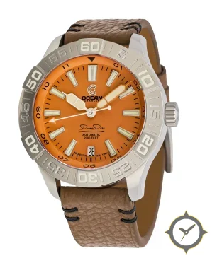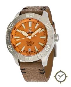 Eine Taucheruhr-Uhr mit einem markanten 47.5mm Auftritt am Handgelenk, gefertigt aus Edelstahl mit einem Zifferblatt in orange und einer besonderen "matte"-Oberfläche.