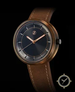 Eine Minimalistisch-Uhr mit einem markanten 46mm Auftritt am Handgelenk, gefertigt aus Bronze mit einem Zifferblatt in marineblau und einer besonderen "sunburst"-Oberfläche.