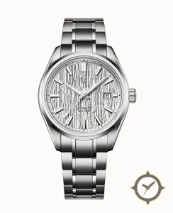 Eine Luxus-Uhr mit einem markanten 44.5mm Auftritt am Handgelenk, gefertigt aus Edelstahl mit einem Zifferblatt in silber und einer besonderen "vertical bark/teak-like textured finish"-Oberfläche.