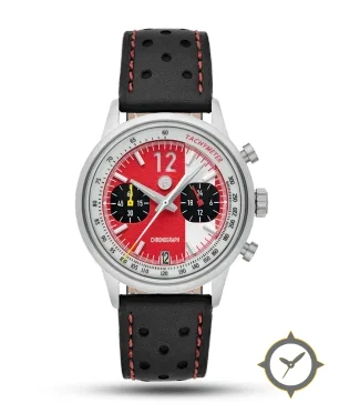 Eine Racing-Uhr mit einem markanten 43mm Auftritt am Handgelenk, gefertigt aus Edelstahl mit einem Zifferblatt in rot und einer besonderen "textured (grained)"-Oberfläche.