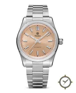 Eine Minimalistisch-Uhr mit einem 37mm Gehäuse im Vintage-Stil gefertigt aus Edelstahl mit einem Zifferblatt in gold und einer besonderen "sunburst"-Oberfläche.