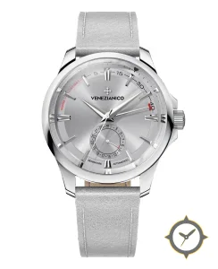 Eine Dress-Uhr mit einem markanten 44mm Auftritt am Handgelenk, gefertigt aus Edelstahl mit einem Zifferblatt in silber und einer besonderen "radial sunburst (brushed)"-Oberfläche und einer praktischen Gangreserveanzeige.