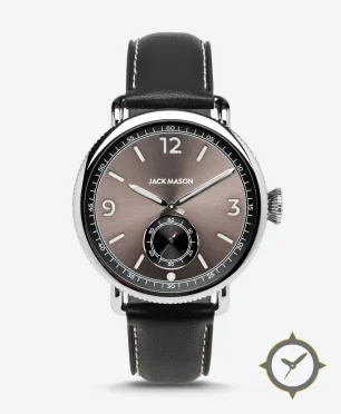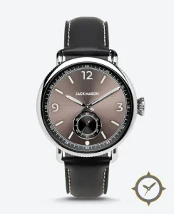 Eine Pilot-Uhr mit einem markanten 44mm Auftritt am Handgelenk, gefertigt aus Edelstahl mit einem Zifferblatt in braun und einer besonderen "sunburst"-Oberfläche.