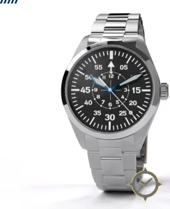 Eine Pilot-Uhr mit einem vielseitigen 40mm Gehäuse, das an fast jedes Handgelenk passt, gefertigt aus Edelstahl mit einem Zifferblatt in schwarz und einer besonderen "matte"-Oberfläche.