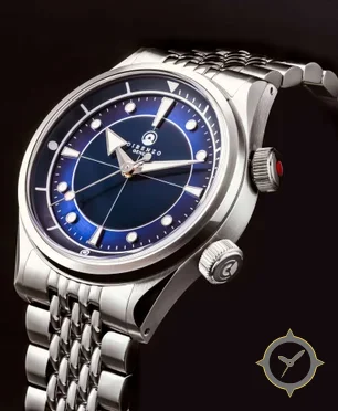 Eine Taucheruhr-Uhr mit einem vielseitigen 39mm Gehäuse, das an fast jedes Handgelenk passt, gefertigt aus Edelstahl mit einem Zifferblatt in blau und einer besonderen "sunburst"-Oberfläche.