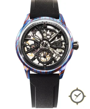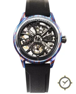 Eine Skelett-Uhr mit einem vielseitigen 41mm Gehäuse, das an fast jedes Handgelenk passt, gefertigt aus Titan mit einem Zifferblatt in schwarz und einer besonderen "openworked / skeleton"-Oberfläche.