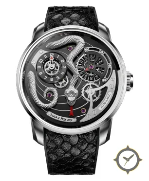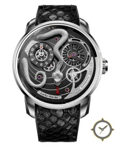 Eine Skelett-Uhr mit einem markanten 41.5mm Auftritt am Handgelenk, gefertigt aus Edelstahl mit einem Zifferblatt in schwarz und einer besonderen "open-worked / skeletonized with visible gears and polished snake motif"-Oberfläche.