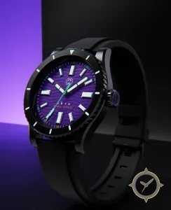 Eine Taucheruhr-Uhr mit einem markanten 43mm Auftritt am Handgelenk, gefertigt aus Edelstahl mit einem Zifferblatt in lila und einer besonderen "embossed wavy texture"-Oberfläche.