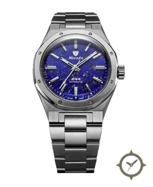 Eine Luxus-Uhr mit einem 33mm Gehäuse im Vintage-Stil gefertigt aus Edelstahl mit einem Zifferblatt in blau und einer besonderen "lapis-style stone with gold flecks"-Oberfläche.