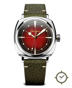 Eine Vintage-Uhr mit einem vielseitigen 39.5mm Gehäuse, das an fast jedes Handgelenk passt, gefertigt aus Edelstahl mit einem Zifferblatt in rot und einer besonderen "sunburst"-Oberfläche.