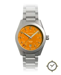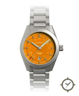 Eine Field-Uhr mit einem markanten 43mm Auftritt am Handgelenk, gefertigt aus Edelstahl mit einem Zifferblatt in orange und einer besonderen "matte textured / grained"-Oberfläche.