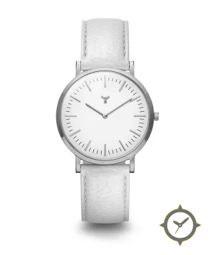 Eine Minimalistisch-Uhr mit einem 33mm Gehäuse im Vintage-Stil gefertigt aus Edelstahl mit einem Zifferblatt in weiß und einer besonderen "matte"-Oberfläche.