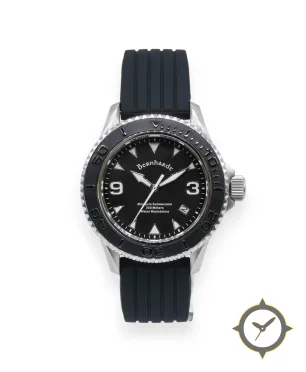 Eine Taucheruhr-Uhr mit einem markanten 43mm Auftritt am Handgelenk, gefertigt aus Edelstahl mit einem Zifferblatt in schwarz und einer besonderen "matte"-Oberfläche.