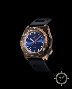 Eine Taucheruhr-Uhr mit einem vielseitigen 40.5mm Gehäuse, das an fast jedes Handgelenk passt, gefertigt aus Bronze mit einem Zifferblatt in blau und einer besonderen "sunburst"-Oberfläche.