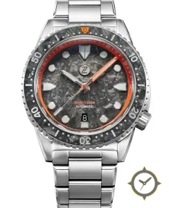 Eine Taucheruhr-Uhr mit einem 34.5mm Gehäuse im Vintage-Stil gefertigt aus Edelstahl mit einem Zifferblatt in grau und einer besonderen "marbled/forged-carbon texture"-Oberfläche.