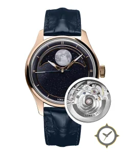 Eine Dress-Uhr mit einem markanten 45.5mm Auftritt am Handgelenk, gefertigt aus Gold mit einem Zifferblatt in marineblau und einer besonderen "aventurine (starry)"-Oberfläche und einer wunderschönen Mondphasenanzeige.
