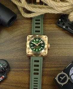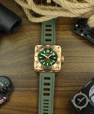 Eine Taucheruhr-Uhr mit einem markanten 44.5mm Auftritt am Handgelenk, gefertigt aus Bronze mit einem Zifferblatt in grün und einer besonderen "sunburst"-Oberfläche.